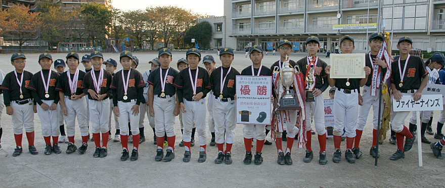 大野(ファイヤー)は、快速球を外角に決めてガッツ打線を抑え、嬉しい優勝を勝ち取りました。