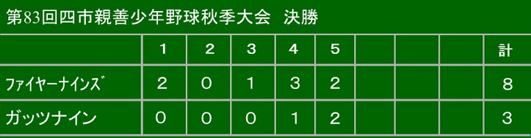 ファイヤーナインズ | 0 | 0 | 1 | 0 | 3 | × | 計4 |
