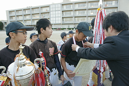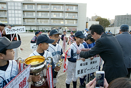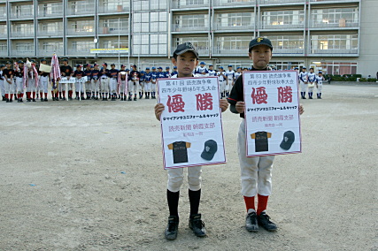 優勝したファイヤーナインズと栗原ビーバーズに 読売新聞社から副賞のジャイアンツユニフォームが 贈られました。 |