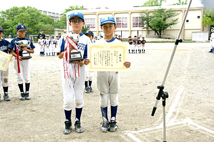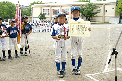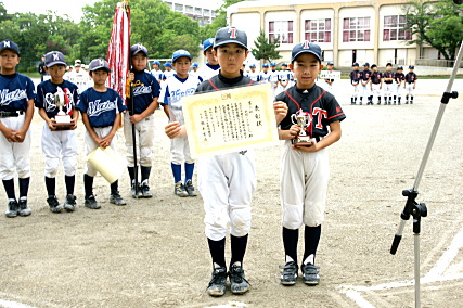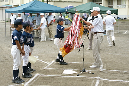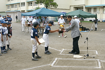 連盟表彰です。 橋本会長から優勝旗が 志木二小メイツに手渡されました。 |