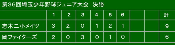 志木二小メイツ | 1 | 0 | 3 | 0 | 2 | × | 計6 |