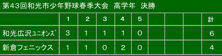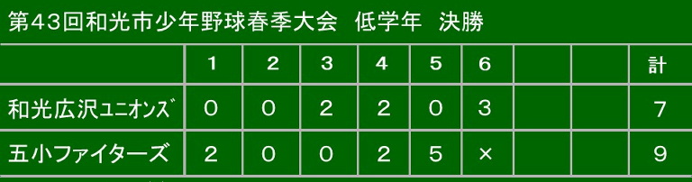 和光広沢ユニオンズ | 0 | 1 | 4 | 1 | 4 | 5 | 計15 |