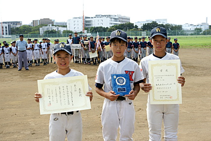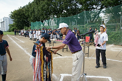 9月22日、和光市秋季大会の表彰式・閉会式が 和光レク広場で行われました。 高学年の表彰です。 優勝旗が五小ファイターズに渡ります。 |
